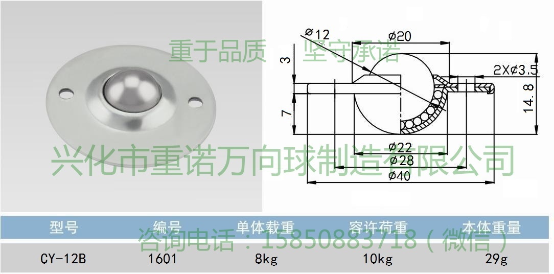 此款万向球为轻型冲压型万向球,标配外壳镀锌,主球选用G200级加硬球,硬度56HRC,质量上层,品质有保证,同款尺寸有全不锈钢型,镀锌外壳尼龙主球,或者不锈钢外壳配尼龙主球。