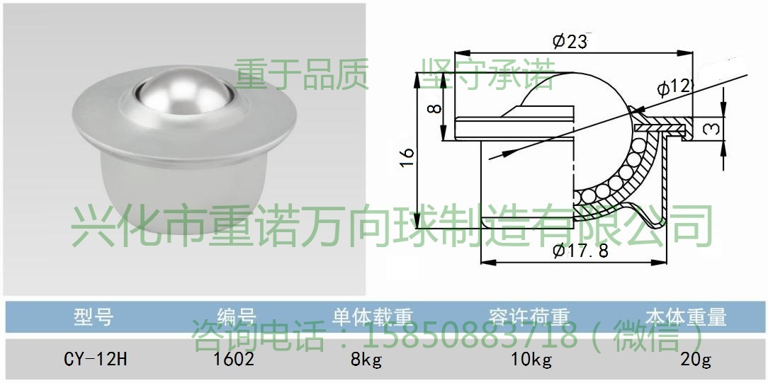 此款万向球为轻型冲压型万向球,标配外壳镀锌,主球选用G200级加硬球,硬度56HRC,质量上层,品质有保证,同款尺寸有全不锈钢型,镀锌外壳尼龙主球,或者不锈钢外壳配尼龙主球。