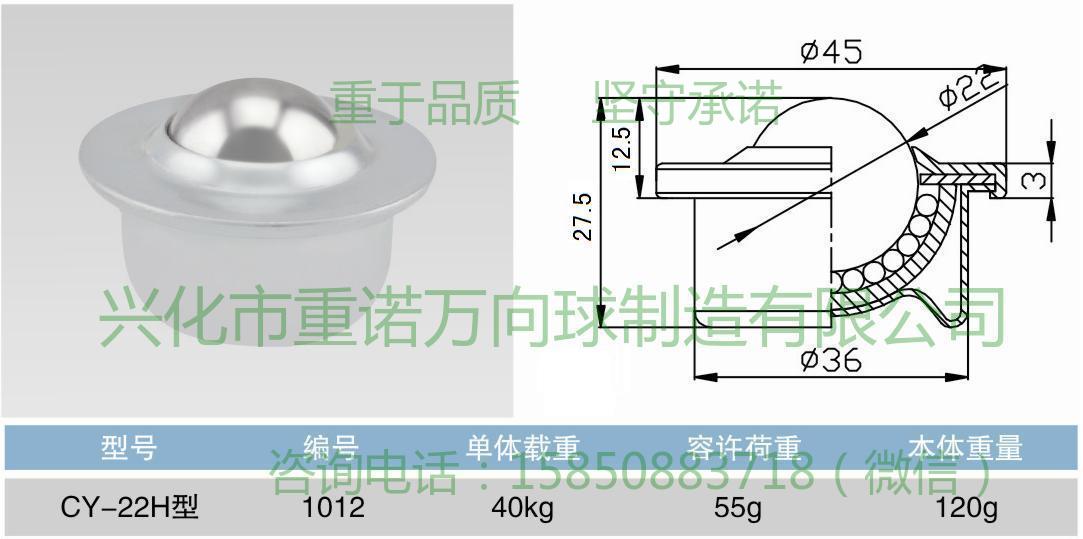 此款万向球为轻型冲压型万向球,标配外壳镀锌,主球选用G200级加硬球,硬度56HRC,质量上层,品质有保证,同款尺寸有全不锈钢型,镀锌外壳尼龙主球,或者不锈钢外壳配尼龙主球。
