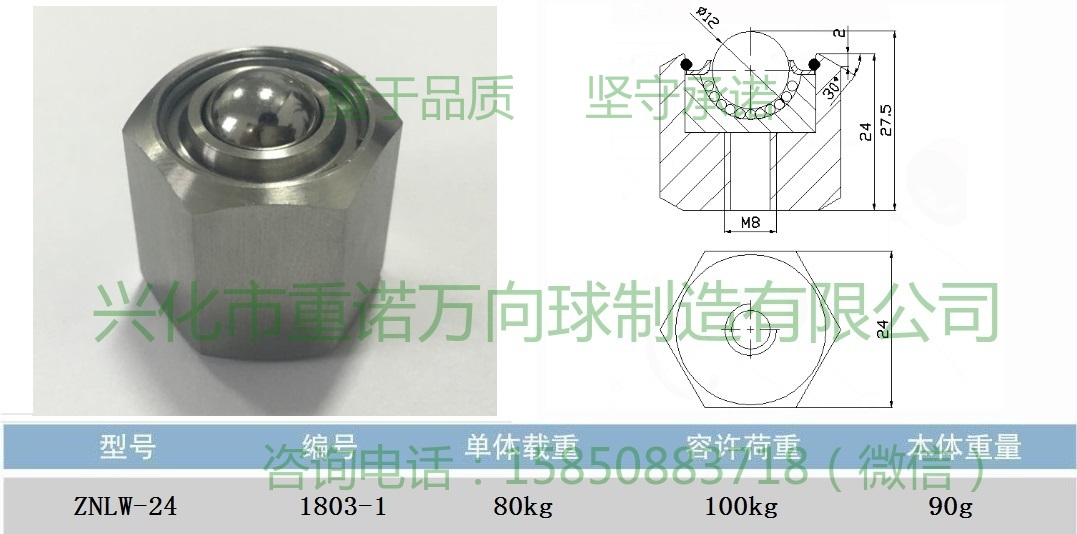 此款万向球为外六角带丝杆型,使用方便,安装时只需在工作台面钻一个螺纹安装孔就可以靠螺杆安装固定,标配40Cr精车成型表面镀铬,球为轴承钢,可以选配主球尼龙球,或者全不锈钢型。
