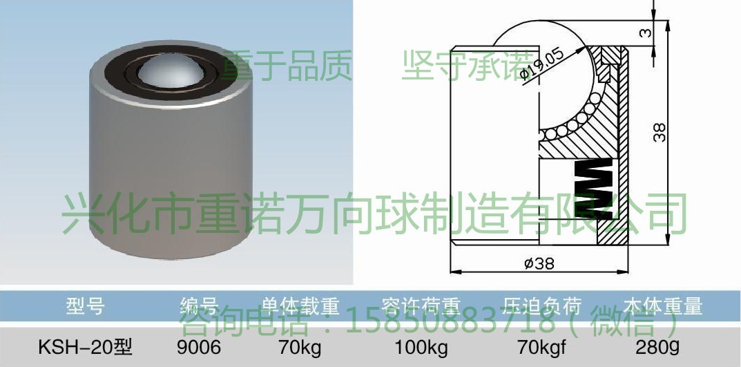 此款为朝上带弹簧系列的万向球,用于当工作表面不平整时,会产生应力不集中的现象,此万向球可以通过减震装置自动调节球体高度,使理论平面出于同一高度,进而达到最佳传输状态,或者用于自动换模具机构,安装时靠上法兰直接固定于工作台面,或者嵌入或法兰孔固定。,以结构复杂,工艺精良著称。标配40Cr精车成型表面镀铬,球为轴承钢,可以选配主球尼龙球,或者全不锈钢型。