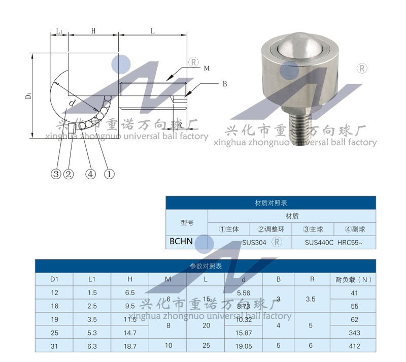 此款万向球为米思米同步型号,替代米思米,价格实惠。外壳材质为SUS304不锈钢,标配440C高硬度不锈钢球,可选配尼龙球